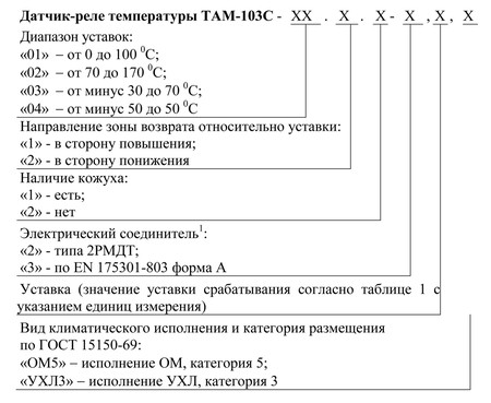 1) датчик-реле температуры ТАМ-103С с направлением зоны возврата в сторону понижения температуры, без кожуха, с соединителем по EN 175301-803 форма А, уставка 55 °С, климатическое исполнение УХЛ3: