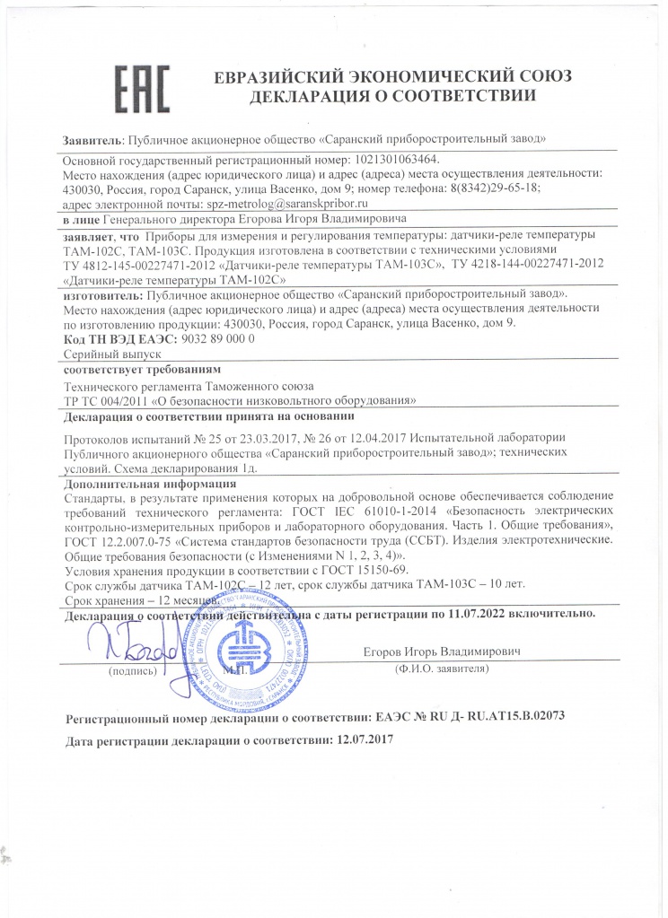 «Датчик-реле температуры ТАМ-103С-01.2.2-3, уставка 550С, УХЛ3 ТУ 4218-145-00227471-2012».