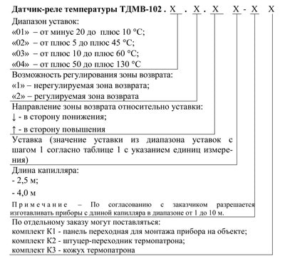 1) прибор ТДМВ-102 с диапазоном уставок от плюс 10 до плюс 60 °С, с нерегулируемой зоной возврата, с направлением зоны возврата относительно уставкив сторону повышения температуры, с уставкой плюс 50 °С, с длиной капилляра 2,5 м