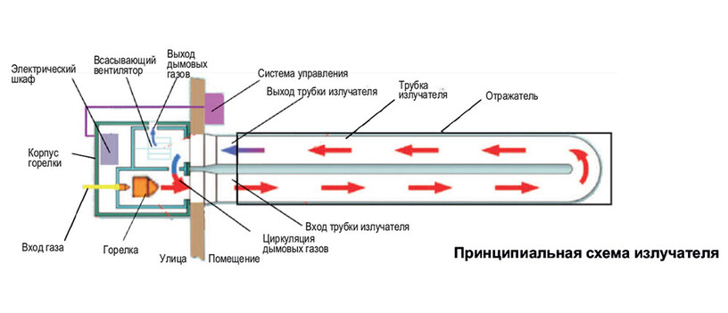 Принцип действия ленточного газового излучателя основан на прохождении горячих выхлопных газов от горелки по трубе большого диаметра, образующей U-образный контур — «ленту». Труба находится в теплоизолированном кожухе, открытом снизу. Благодаря этому, вся тепловая энергия переходит в инфракрасное излучение, направленное вниз. То, что рядом в едином кожухе находится и прямая, и обратная трубы, выравнивает температуру по длине ленты. Нагрев помещения под газо-лучистым обогревателем ленточного типа остается равномерным по всей его длине.