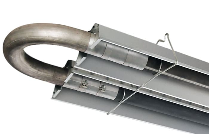 Конструкция излучателей продумана до мелочей: используются трубы из алюминизированной стали со стенкой 1,5 мм, установлен эффективный раздельный отражатель с торцевыми заглушками, применяется фланцевое крепление горелки и мощный дымосос, а соединительные элементы выполнены с повышенной прочностью. Большой радиус цельных колен повышает долговечность и устойчивость системы к нагрузкам.