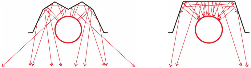 Эффективность инфракрасных излучателей во многом зависит от формы рефлектора, которая влияет не только на коэффициент полезного действия, но и на срок службы излучающих труб. В приборах KEYWARM применяется «параболический» рефлектор, благодаря которому плотность направленного излучения в рабочую зону значительно выше, чем у обычного плоского рефлектора, используемого многими конкурентами. В отличие от плоского варианта, где значительная часть энергии переотражается на верхнюю часть трубы, вызывая её перегрев и преждевременный прогар, «вдавленный» участок рефлектора KEYWARM аккуратно отклоняет поток тепла вниз, обеспечивая равномерное обогревание нужной зоны и продлевая срок службы излучающих труб.
