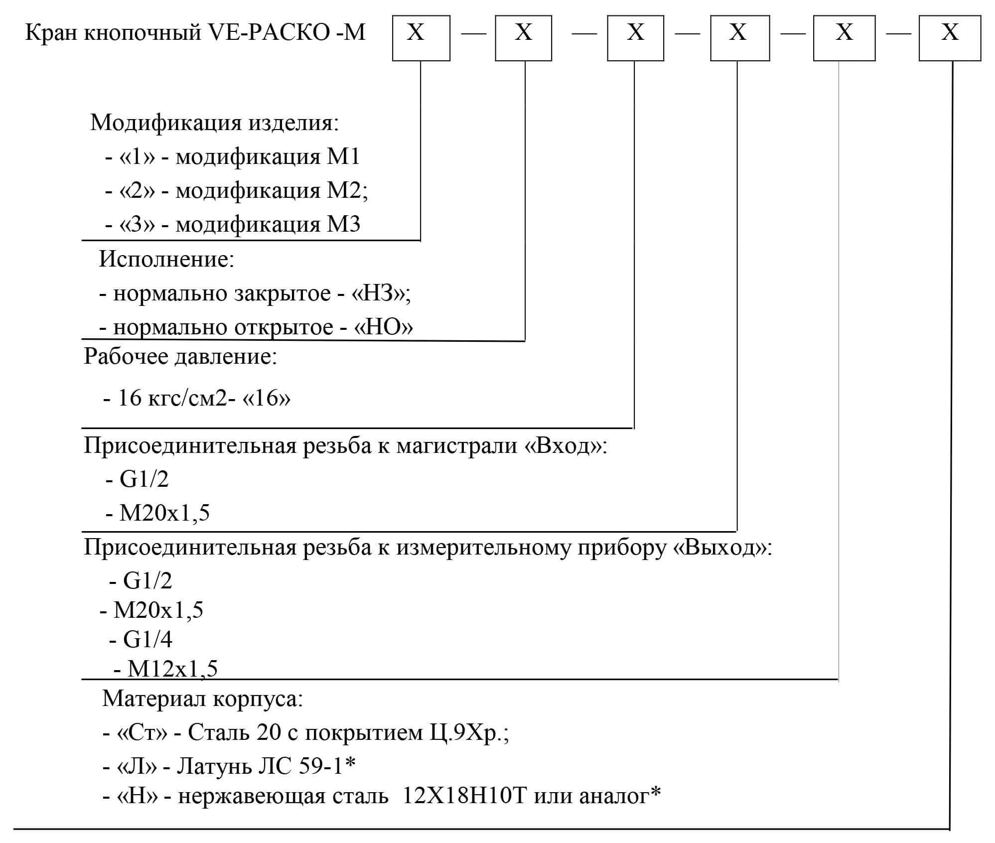 а) Кран кнопочный VE-РАСКО нормально открытого исполнения (НО), применяемый при рабочем давлении в магистрали до 1,6 МПа, с присоединительной внутренней резьбой к магистрали (вход) G1/2 и имеющий внутреннюю резьбу (выход) М20×1,5 для подсоединения измерительного прибора: