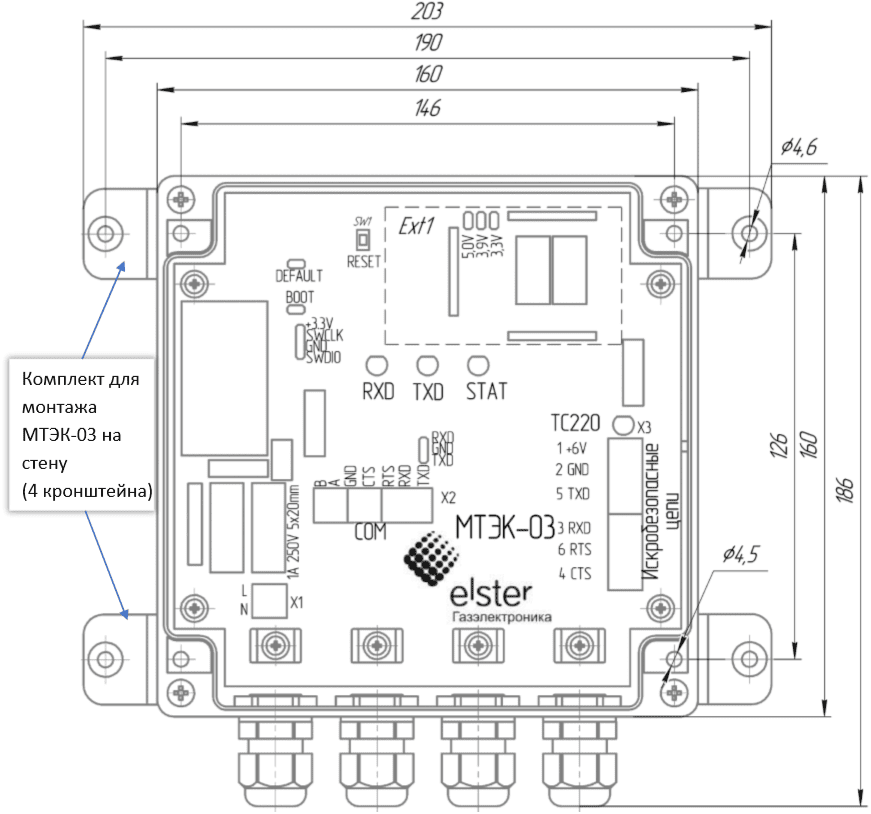 Конструкция модуля МТЭК-03 предусматривает возможность настенного монтажа: в корпусе выполнены специальные отверстия для крепления. В комплект поставки входят монтажные кронштейны, которые устанавливаются при необходимости непосредственно на месте эксплуатации.