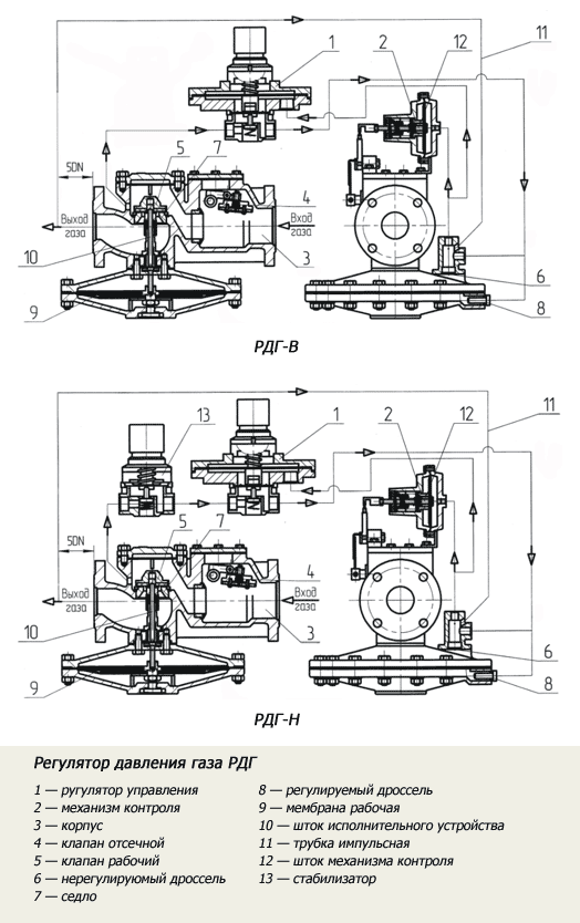 Регуляторы давления газа серии РДГ (модели РДГ-25, РДГ-50, РДГ-80, РДГ-150) предназначены для эксплуатации в составе газорегуляторных пунктов (ГРП) и газорегуляторных установок (ГРУ) коммунально-бытовых, промышленных, городских и сельских систем газоснабжения.