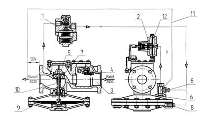 1 — регулятор управления КВ-2; 2 — механизм контроля; 3 — корпус; 4 — клапан отсечной; 5 — клапан; 6 — нерегулируемый дроссель; 7 — седло; 8 — регулируемый дроссель; 9 — мембрана; 10 — шток исполнительного устройства; 11 — трубка импульсная; 12 — шток механизма контроля