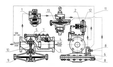 1 — регулятор управления КВ-2; 2 — механизм контроля; 3 — корпус; 4 — клапан отсечной; 5 — клапан; 6 — нерегулируемый дроссель; 7 — седло; 8 — регулируемый дроссель; 9 — мембрана; 10 — шток исполнительного устройства; 11 — трубка импульсная; 12 — шток механизма контроля; 13 — регулятор управления КН-2