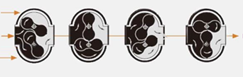 Работа ротационных счетчиков газа RVG основана на принципе вытеснения строго определенного объема газа вращающимися роторами. Объем перемещаемого газа определяется размерами измерительной камеры, образованной внутренней поверхностью корпуса и двумя синхронно вращающимися роторами.