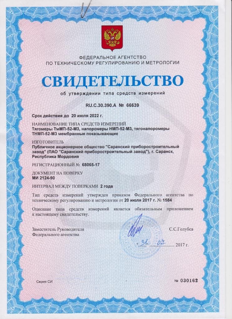 Межповерочный интервал тягомеров ТмМП-52-М3, тягонапоромеров ТНМП-52-М3 — 2 года.